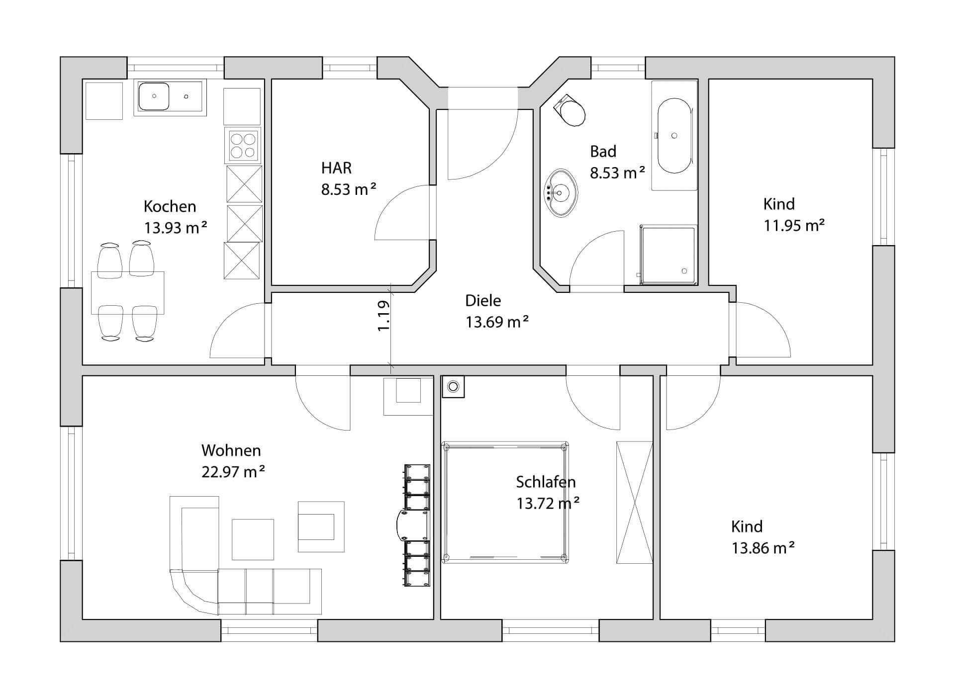 Abgebildet sind mögliche Grundrissvarianten, sie stellen Gestaltungsvorschläge dar. Ihr Haus wird ganz individuell für Sie geplant. Die Abbildungen zeigen z.T. auch Sonderausstattungen. Kontaktieren Sie uns gern für Ihre detaillierten Fragen.