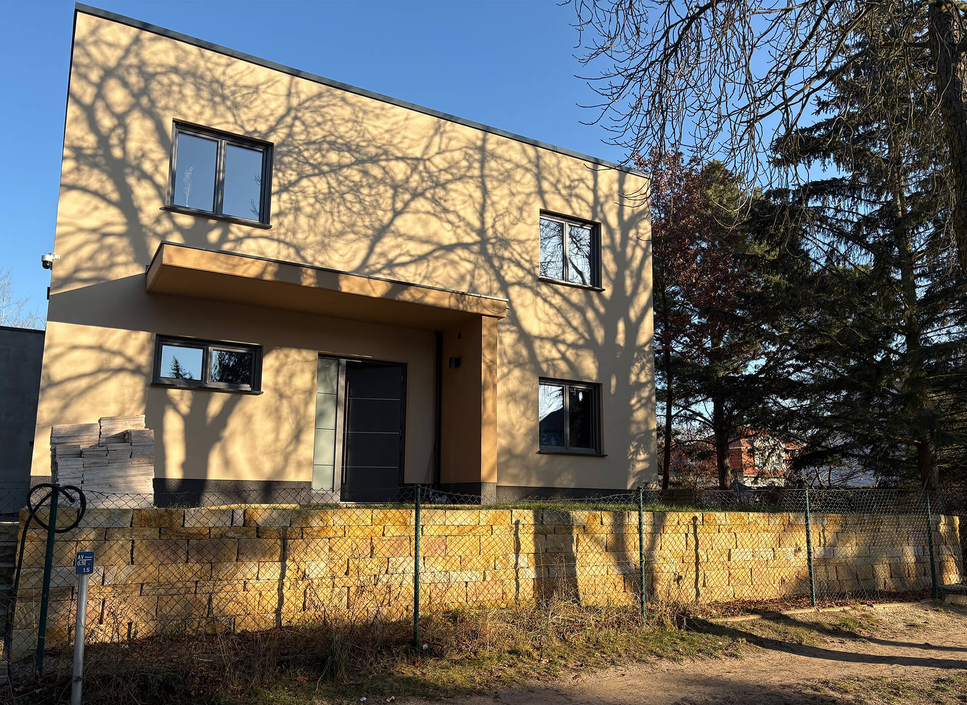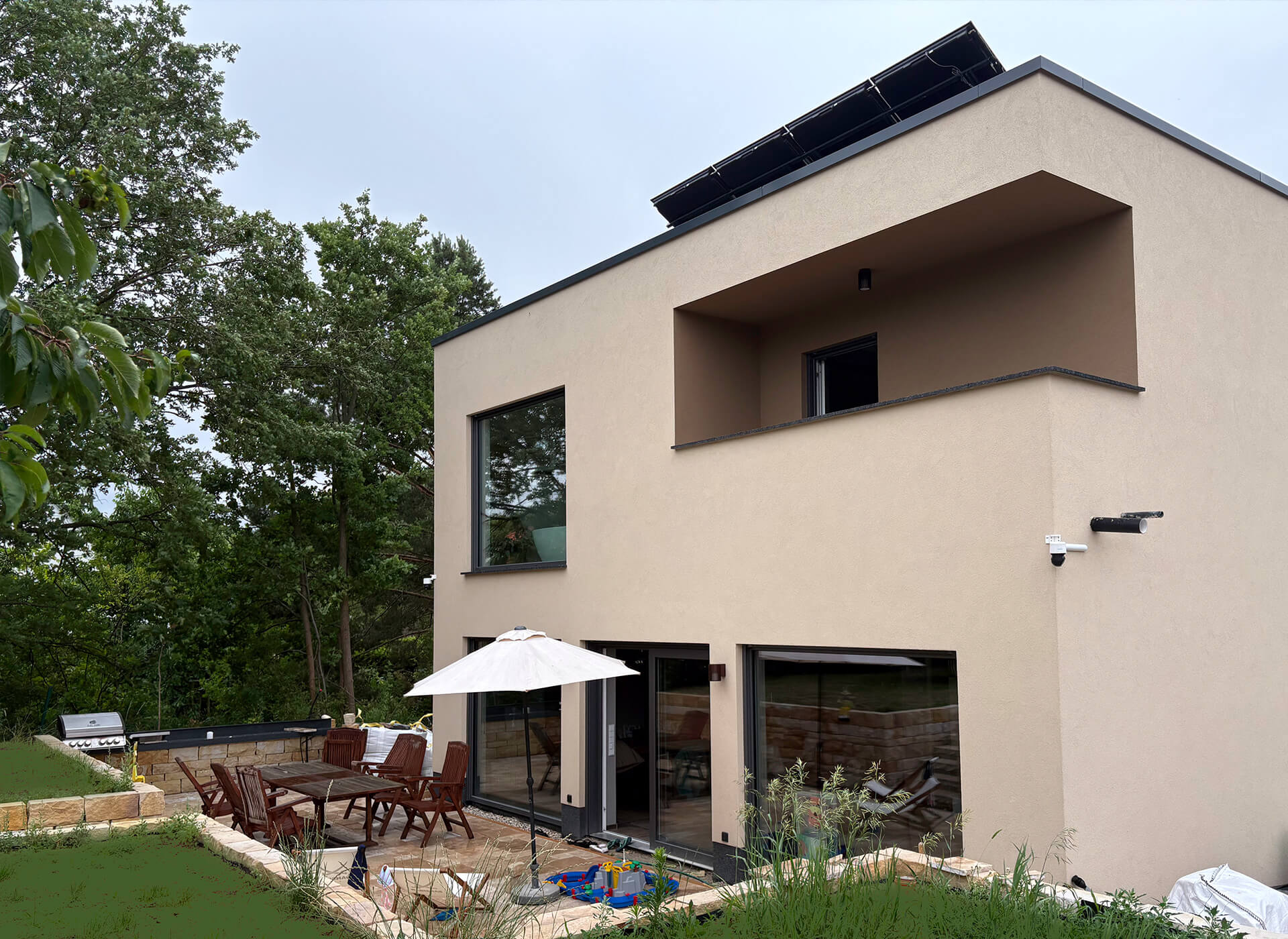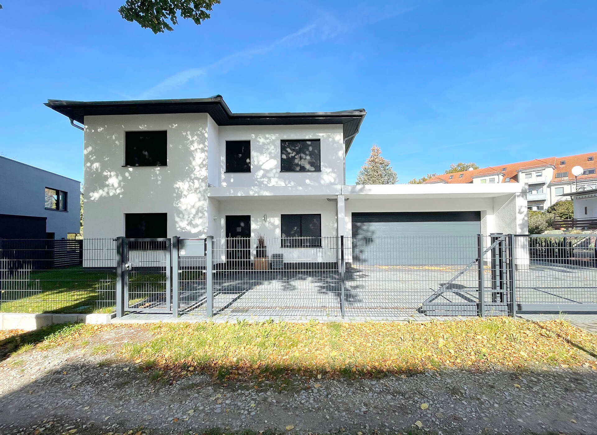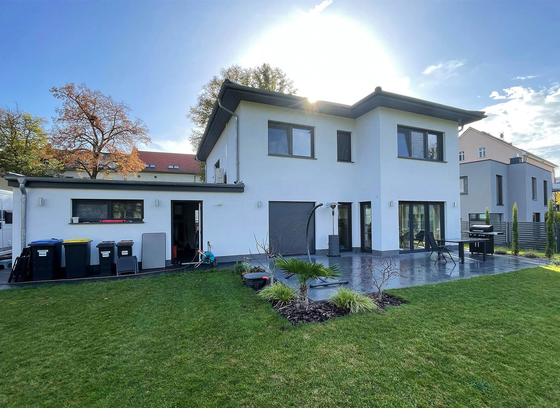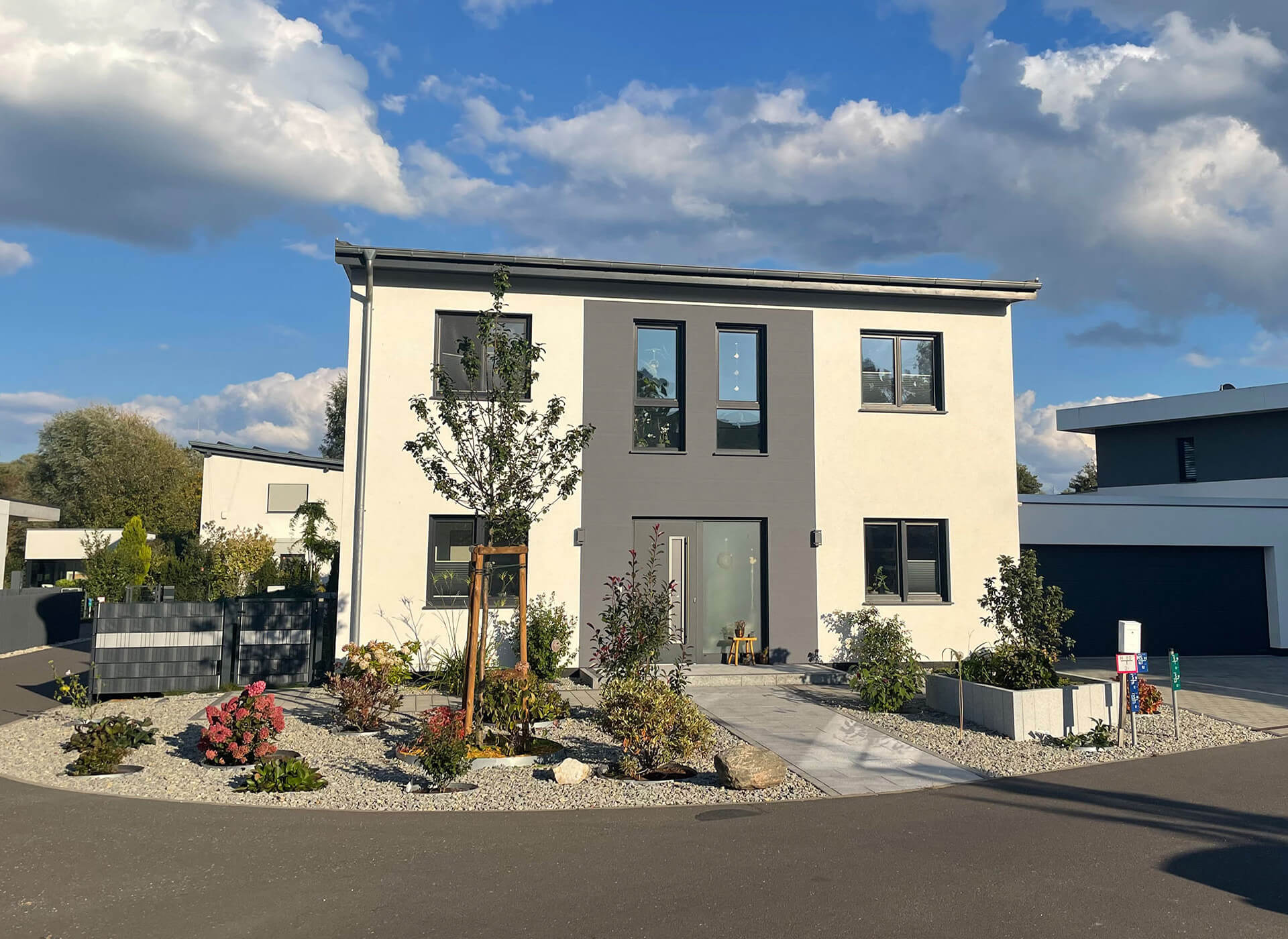 Stadtvilla mit seitlichem Erker und Kragplatte über Eingangsbereich und Garage